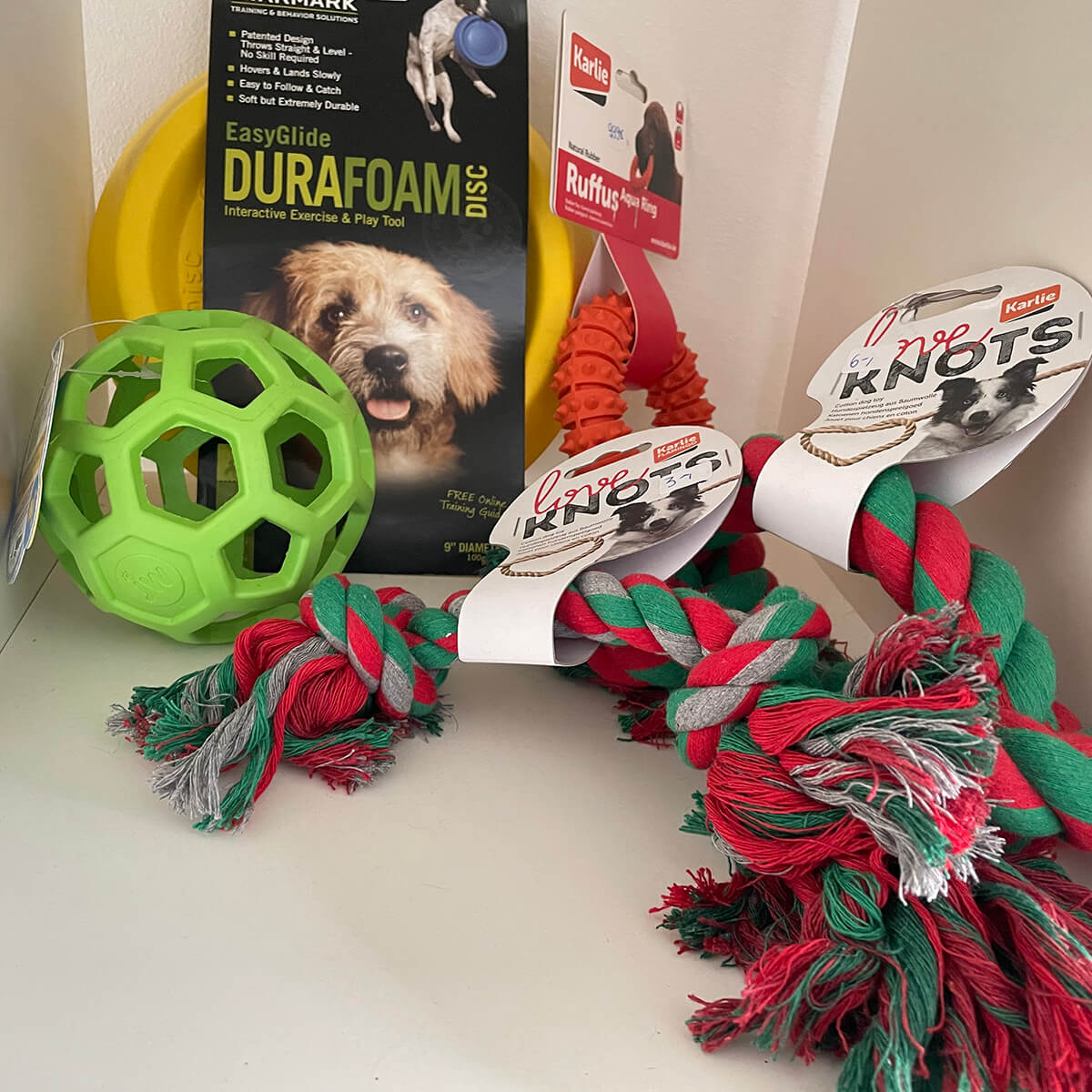 - Spielsachen (Bälle, Dummies, Quitschesachen, Baumwollknoten u.s.w.)